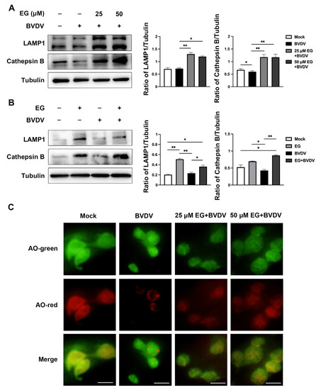 EG promotes lysosomal acidification and protease activity to prevent BVDV infection. (A) MDBK cells were treated with EG at 25, 50 µM after BVDV (MOI = 1) infection for 24 h. The protein levels of LAMP1 and cathepsin B were detected by Western blot, using Tubulin as a control. (B) MDBK cells were infected with BVDV and treated with EG at 50 µM for 24 h. The protein levels of LAMP1 and cathepsin B were assessed by Western blot, using Tubulin as a control. (C) MDBK cells were stained with acridine orange (AO) for 15 min and detected by immunofluorescence assay using a 488 nm (green) or a 561 nm (red) laser. Scale bar, 50 µm. Data represent mean ± SEM (n = 3). * p < 0.05, ** p < 0.01.