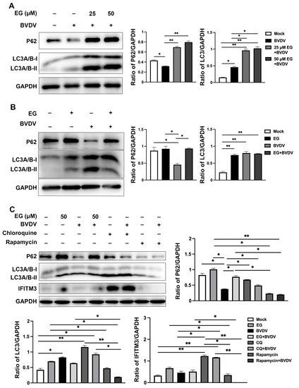 A primary characteristic of autophagy is the stimulation of innate and adaptive immune responses to eliminate and destroy the invading virus [14,28]. Autophagy activates the innate immune response of the body by binding to pattern recognition receptors (PAMPs) signals to induce interferon production [14]. But autophagy can be a double-edged sword for viral infection, such as is the case for some RNA viruses that can use autophagy to complete their replication. In our previous work, we found that BVDV infection could activate the autophagic process, which facilitates viral replication [29]. Hence, we postulated that EG could potentially exhibit antiviral effects by modulating autophagy. The effect of EG on autophagy was detected in MDBK cells, which were treated with different concentrations of EG (25 and 50 µM), and Western blot analysis was applied to measure the protein expression levels of p62 and LC3. In comparison to the control group, the level of LC3 expression was upregulated in BVDV-infected or EG-treated groups (Figure 6A,B), indicating the accumulation of autophagosomes after BVDV or EG treatment. LC3 is essential for autophagosome formation and is used as an autophagosome marker. Then, we also measured the levels of p62 and found a significantly higher expression in EG-treated group compared to the control group, yet a significantly lower expression in the BVDV-infected group (Figure 6A,B). EG increased the levels of LC3 and p62, indicating that EG may block autophagic degradation. To support the evidence that EG may prevent that degradation caused by BVDV infection in MDBK cells, Chloroquine (CQ) and Rapamycin (Rapa) were used in the subsequent study. Rapa, an inhibitor of mTOR, activates autophagy [30]. CQ is a critical inhibitor of the late stage of autophagy, which can block autophagy by decreasing autophagosomal lysosomal fusion [31]. Western blot analysis suggested that CQ treatment significantly enhanced the expression levels of LC3 and p62, which was consistent with the EG treatment group results (Figure 6C). Interestingly, LC3 protein expression was enhanced, and p62 protein expression was decreased, in the Rapa-treated group compared to the control group, with the same result for the BVDV infection (Figure 6C). Of note, we examined the expression of IFITM3 in MDBK cells and observed a remarkable upregulation of IFITM3 following treatment with CQ or EG, and a significantly reduction in the level of IFITM3 following Rapa treatment (Figure 6C). This data suggests that EG might regulate IFITM3 expression through autophagy. According to the above results, we hypothesized that BVDV induces autophagic flux, whereas EG might block the autophagy in the late stage, indicating that EG inhibits viral replication by blocking autophagy induced by BVDV. However, more studies are required to explore the relationship between IFITM3 and autophagy.