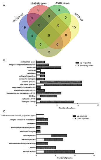 Venn diagram of differentially expressed proteins in 17978S, 17978R, A54R, and A54S, and GO classification of the differentially expressed proteins. (A) Venn diagram; (B,C) show the number of differential proteins of 17978 S/R (B) and A54 R/S (C) in each GO type, respectively. Up-regulation means that the protein expressed in the resistant strain R has a foldchange ≥2 compared to that of the susceptible strain S, and down-regulation means that the expression of the protein in the resistant strain R has a foldchange ≤1/2 compared to that of the susceptible strain S.