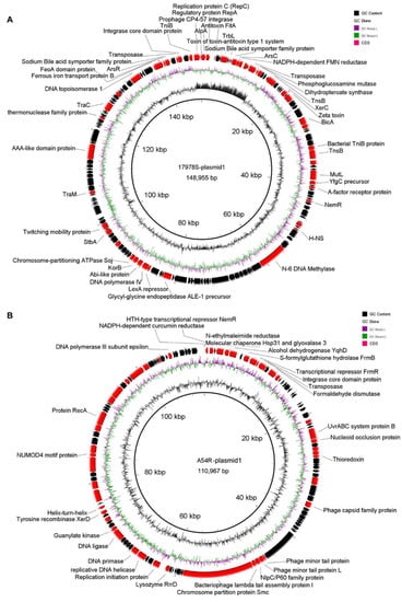 Coding genes on 17978S-plasmid 1 and A54R-plasmid 1 were lost during selection. (A) 17978R-plasmid 1 BRIG circle diagram, from outside to inside, gene-encoding protein (black represents hypothetical protein, red represent coding genes), GC skew, and GC content; (B) A54R-plasmid 1 BRIG circle diagram, from outside to inside, gene-encoding protein (black represents hypothetical protein, red represent coding genes), GC skew, and GC content.