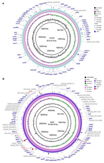 17978S and A54R both contain two plasmids, with sizes of 148,955 bp (17978S-plasmid 1) and 24,822 bp (17978S-plasmid 2) in 17978S, and 110,967 bp (A54R-plasmid 1) and 69,098 bp (A54R-plasmid 2), respectively. Compared with 17978S, the large plasmid (17978S-plasmid 1) was lost in the selected strain 17978R. The plasmid 17978S-plasmid 1 contains 156 encoding genes, 105 of them encoding hypothetical proteins; the remaining genes encode proteins involved in plasmid conjugation and replication, growth metabolism, virulence, and transposition. It is worth noting that a hns gene was found in this plasmid. No genes directly related to antibiotic resistance were found (Figure 2A). Compared with A54R, the large plasmid (A54R-plasmid 1) with a size of 110,967 bp was lost in the selected strain A54S (Figure 2B). The A54R-plasmid 1 shares high similarity to the plasmid pXH386 of A. baumannii XH386 (query cover = 100%, percent identity = 100%). XH386 is an MDR strain isolated from a pediatric hospital in China [], and its ST type belongs to ST208, showing resistance to most antibiotics, such as tetracycline and levofloxacin. The genes on this plasmid encode phage-related proteins, enzymes, including S-formyl glutathione hydrolase, S-(hydroxymethyl) glutathione dehydrogenase, and transporters, including phosphonate/organophosphate ester transfer proteins, IS and transposases, transcriptional regulators, including FrmR [], DNA synthesis, and repair-related proteins (Figure 2B). These proteins are mainly involved in growth, metabolism, and regulation, and their functions are similar to those on 17978S-plasmid 1.