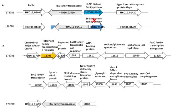 IS transposition can affect the antibiotic resistance and virulence of bacteria by changing gene expression []. We used ISEscan [] to analyze the distribution of IS in the strains and found that in 17978S, there is a gene encoding the IS5 family transposase adjacent to the hns gene, while it translocated into the hns gene in the tigecycline-selected strain 17978R, resulting in the disruption of hns (Figure 4A). At the same time, we found an IS5 insertion between the genes HKO16_11790 and HKO16_11865, leading to the loss of 15 coding genes, including the gene acrR (Figure 4B). Previous studies have shown that H-NS is a global regulator and is involved in the regulation of antibiotic resistance [], natural transformation [], and virulence [], and AcrR is an efflux pump regulator. We then tested whether the insertion of the IS element in the two regions could influence tigecycline sensitivity.