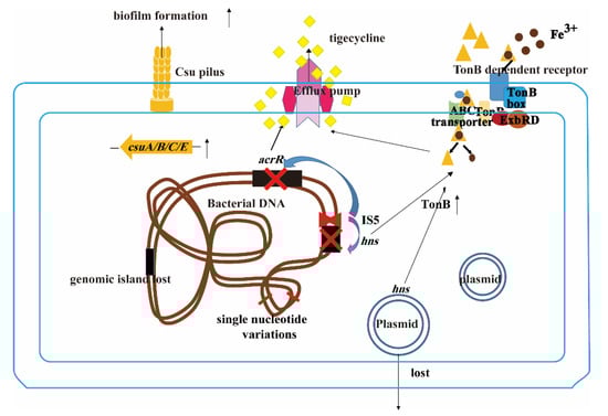 In conclusion, in this study, we found a variety of mechanisms related to tigecycline resistance. The overwhelming data indicated that the mechanism of tigecycline resistance is complex. However, we still found a correlation between these results. Our study showed efflux pump is up-regulated in tigecycline-resistant strains and is the key mechanism for tigecycline resistance. By genomics analysis, we found several changes in the genome, which can explain this phenomenon (Figure 6), including the loss of the global negative regulator hns in the plasmid and the disruption of the hns gene and acrR gene on the chromosome by the insertion of IS5. Loss of hns can result in increased expression level of TonB, which can increase the expression level of efflux pump. Previous studies have found some relationship between efflux pump and tigecycline resistance, however, no studies revealed the mechanism behind it. Taken together, the tigecycline resistance mechanism of A. baumannii is complex and we not only revealed the phenomenon that efflux pump is mainly responsible for tigecycline resistance, but also highlighted the mechanism at the genomic level. To our knowledge, this is the first study elaborating this issue from both proteomics and genomics analysis.