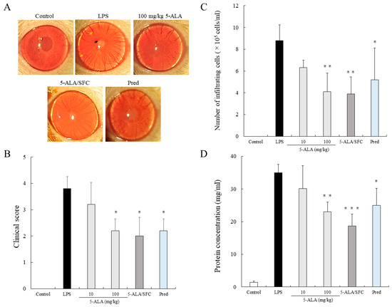 No inflammatory reaction was observed in the control group. In the LPS group, the clinical score was 3.8 ± 0.45 (mean ± SD, n = 5), and intense iridal hyperemia and fibrous exudates were observed in the pupillary area. The clinical scores were 3.2 ± 0.84, 2.2 ± 0.45 (p < 0.05, vs. LPS), 2.0 ± 0.71 (p < 0.05, vs. LPS), and 2.2 ± 0.45 (p < 0.05, vs. LPS) when treated with 10 or 100 mg/kg of 5-ALA, 5-ALA/SFC (10 mg/kg 5-ALA plus 15.7 mg/kg SFC), and 1 mg/kg Prednisolone (Pred), respectively. The 5-ALA/SFC, 100 mg/kg 5-ALA, and 1 mg/kg Pred alleviated iridal hyperemia, and no fibrous exudates were observed. No differences were found between the clinical scores of 100 mg/kg 5-ALA, 5-ALA/SFC, and Pred (Figure 1A,B).