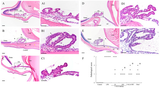 Histological evaluation of EIU rats treated with 5-ALA/SFC in the anterior segment of the eye in rats 24 h after LPS injection. (A,A1) There was no sign of infiltration in the control group. (B,B1) In the LPS group, there was a severe inflammatory cellular infiltrate in the iris stroma, CB, and AC, and a large volume of exudate with dense protein aggregation in the AC. (C–E) In the anterior segment of rats treated with 100 mg/kg 5-ALA, 5-ALA/SFC, and the Pred group, inflammatory cells, and protein exudates were reduced. (A1–E1) These are enrarged version of the area in black square in (A–E). Black arrows mark infiltrating cells. Yellow arrows mark dense protein exudation. Hematoxylin and eosin staining, H&E staining. Original magnification: (A–E) ×100, Bars, 100 µm; (A1–E1) ×400, Bars, 50 µm; AC, anterior chamber; CB, ciliary body. (F) Effect of 5-ALA/SFC on the histologic grading of EIU. Points indicate each rat’s means of histopathologic grading (n = 5). * p < 0.05, compared with the LPS group. EIU, endotoxin-induced uveitis. Pred, prednisolone.