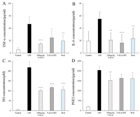 5-ALA/SFC suppressed (A) TNF-α, (B) IL-6, (C) NO, and (D) PGE2 levels in the AqH at 24 h after LPS injection. Each value represents the mean ± SD (n = 5). * p < 0.05, ** p < 0.01, and *** p < 0.001, compared with the LPS group.