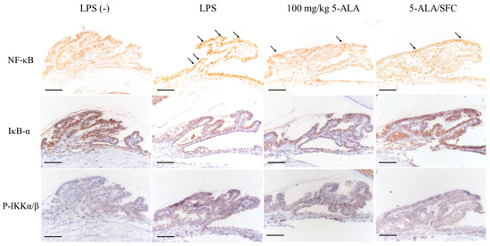 Immunoreactivity of activated NF-κB p65 was strongly expressed, and nuclear translocation was observed in the LPS group ICB 3 h after LPS injection. 5-ALA/SFC inhibited NF-κB p65 expression in ICB. No activated NF-κB p65-positive nuclei were detected in the control group ICB. IκB-α degradation and p-IKKα/β expression in ICB were inhibited by 5-ALA/SFC. In 100 mg/kg doses, 5-ALA regulated the NF-κB pathway similarly to 5-ALA/SFC (Figure 5).