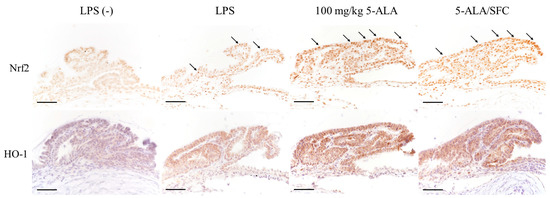 5-ALA/SFC activated the HO-1/Nrf2 pathway in the ICB 3 h after LPS injection. 5-ALA/SFC activated Nrf2 and increased HO-1 expression in ICB more than in the LPS group. Bars: 100 µm. Arrows: activated Nrf2 positive cells.
