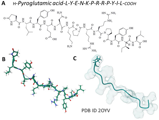 The tridecapeptide NT was isolated from the bovine hypothalamus (Figure 2). It is involved in gut motility and belongs to a family of bioactive peptides, including contulakin, xenopsin, LANT-6, and neuromedin, showing similar amino acid sequences at the C-terminal region; this sequence is essential for the physiological effects mediated by these peptides [33].