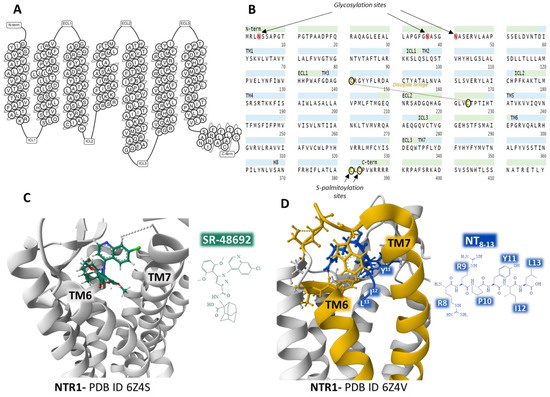 Structure of the seven transmembrane domains of the NTR1 (A) [58] and complete amino acid sequence of NTR1, indicating post-translational modifications (B) [57]. Structure of the NTR1 bound to the inverse agonist SR-48692 and the position of transmembrane domains TM6 and TM7 (C) [59]. Installation of the agonist peptide NT8–13 bound to NTR1 (D) [59]. (C,D) were obtained from the Protein Data Bank [35] and modified with the free-web-based software Mol* (https://molstar.org/ (accessed on 4 March 2023)) [60].