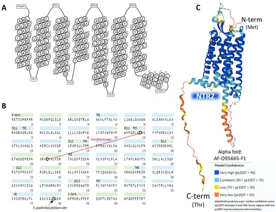 Structure of the seven transmembrane domains of NTR2 (A) [58]. The complete amino acid sequence of NTR2 indicates post-translational modifications (B) [57]. The AlphaFold prediction of the structure of NTR2 is represented in (C) [57].