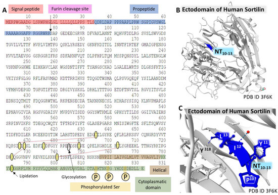 The protein has a signal peptide on the N-terminal end and a site for furine hydrolysis. It presents a single transmembrane domain and sequence analogies with Vps10p (on the extracellular domain) and CI-M6PR (cation-independent mannose 6-phosphate) receptor (cytoplasmic region) [52,72]. Figure 5 summarizes the complete amino acid sequence and the post-translational modifications of sortilin, as described (A). Panels B and C partially view the glycoprotein crystal structure bound to NT and resolved with X-ray diffraction.