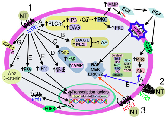 After binding to NTR1, the peptide activates the Wnt/beta-catenin pathway and the transcription of the epidermal growth factor receptor and NTR1 genes; activates diacylglycerol lipase and phospholipase 2, promoting the release of arachidonic acid; favors cyclic adenosine monophosphate synthesis and activates protein kinase A, which regulates the transcription of the early growth response protein 1, activator protein 1, erythroblast transformation specific line-1 protein, and c-myc genes; activates focal adhesion kinase, proto-oncogen tyrosine-protein kinase, and small Rho GTPases, and the latter activates transcription factors. NT also activates phospholipase C-gamma, producing inositol triphosphate 3 and diacylglycerol. The former promotes the release of Ca++ from the endoplasmic reticulum, switching on protein kinase C, which, in turn, activates metalloproteinase and protein kinase D. Metalloproteinase cleaves and releases the epidermal growth factor that binds to its receptor, epidermal growth factor receptor 2 or epidermal growth factor receptor 3, thus favoring the activation of mitogen-activated protein kinase 1/2, mitogen-activated protein kinase, and RAF (rapidly accelerated fibrosarcoma). Epidermal growth factor-epidermal growth factor receptor binding activates the phosphatidylinositol 3-kinase-serine-threonine protein kinase pathway; NT favors the phosphorylation of insulin growth factor receptor 1 and triggers nuclear factor kappa light chain enhancer of activated B cells [38]. The signaling pathways mediated by NTR2/NTR3 are not well known; the main molecules involved in these pathways, after NTR2 or NTR3 activation, are mitogen-activated protein kinase 1/2 (for NTR2) and beta-catenin, tropomyosin receptor kinase B, ras homolog family member, ras-related C3 botulinum toxin substrate 1, protein kinase C, phosphatidylinositol 3-kinase, metalloproteinase, integrin, focal adhesion kinase, mitogen-activated protein kinase 1/2, epidermal growth factor receptor, and adenylyl cyclase (for NTR3) [38,74].