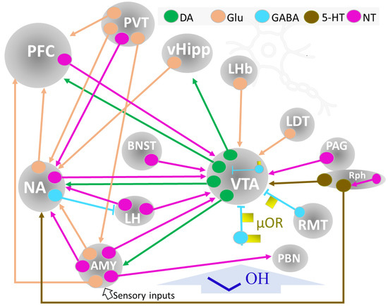 Dopaminergic neurons in the VTA extend their axons to the NA (nucleus accumbens), prefrontal cortex (PFC), and amygdala (AMY), forming the mesocorticolimbic system, a critical network for reward management. A set of GABA interneurons within the VTA, modulated by μ-opioid receptors (μOR), play a significant role in reward mechanisms by inhibiting dopaminergic activity. One of the main destinations of VTA dopaminergic neurons’ output is the NA. In addition, the NA receives glutamatergic control inputs from the PFC, hippocampus, and basolateral amygdala (BLA) [25]. The PFC is responsible for executive control and planning to obtain the reward (for example, seeking a substance of abuse, including alcohol). Dopaminergic VTA and glutamatergic NA inputs inform this activity. The glutamatergic connections between the ventral hypothalamus (vHipp) and NA provide pertinent emotional information to modulate reward-related behavior.