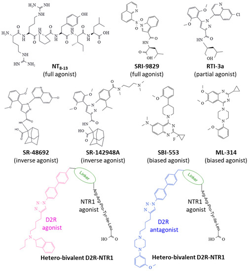 A group of ligands that show bivalent binding capacity may serve as valuable tools to target heterodimeric receptors. Bivalent ligands can bind two different proteins and hence regulate their activity. In their core structure, two pharmacophores are attached through a linker structure. Figure 8 shows the construction of two hetero-bivalent compounds that bind to the dopamine receptor 2-NTR1 complexes (heterodimers with a significant function in addiction and other brain disorders). Interestingly, the length of the linker moiety determines the affinity for different heterodimers where NTR1 participates [55,56]. Moreover, homo-bivalent ligands for the dopamine 2 receptor promote their homodimerization and reduce the formation of dopamine 2 receptors-NTR1 heterodimers, thus influencing the activity of homo and heterodimers [55]. Therefore, synthesizing bivalent ligands opens a new window for drug design directed to the modulation of NTR1 activity in alcohol addiction and other pathologies.