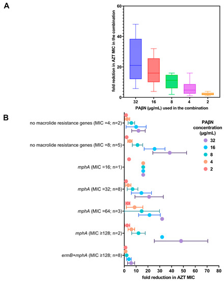 Reduction in AZT MIC when used in combination with PAβN. (A) Fold reduction of AZT MIC in combination with different doses of PAβN (2–32 µg/mL). The fold reduction shown is the mean ± SD of all the strains regardless of the AZT MIC, while (B) shows the relation of AZT MIC (alone) with the genotypes of the strains with fold reduction in AZT MIC when used in combination with different doses of PAβN. n represents the number of strains per group.
