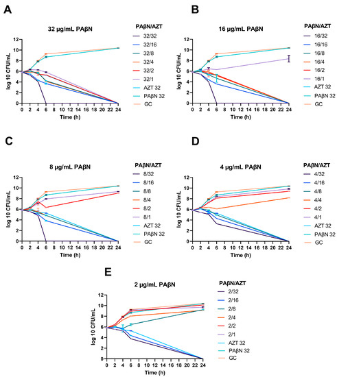 Synergistic effect of PAβN with AZT, demonstrated by time-kill graphs. A selected E. coli strain (CDC AR-0346) is shown. Different synergistic combinations of PAβN (2–32 µg/mL) and AZT (1–32 µg/mL) were tested (A–E). PAβN and AZT (32 µg/mL) were used as controls in addition to an untreated growth control (GC). PAβN had no antibacterial activity when used alone, while synergistic combinations with AZT ≤ ½ X MIC killed the bacteria, depending on the concentration of PAβN used. The data shown represent the mean value of duplicates from two independent experiments ± SD.