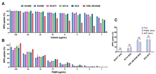 Assessment of outer membrane permeability by 1-N-phenylnaphthylamine (NPN) assay in six selected E. coli strains. Data shown represent % of NPN uptake by bacteria treated with a serial dilution (0.5–128 μg/mL) of colistin, used as a positive control (A), and PAβN (B). Four selected bacteria treated with the synergetic combination of PAβN and AZT (concentrations reported between the brackets, respectively) at FICI in comparison with treatment with a single agent are shown in (C). ns represents a non-significant difference. The EC469 and EC500 strains were not included in figure (C) as synergy was not effective on these two strains, which carried both ermB and mphA, in contrast to the other strains, which carried the mphA gene only.