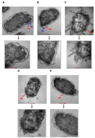 Transmission electron micrographs of E. coli strain EC500. Untreated cells (A) and cells treated with AZT—128 µg/mL (B) are shown with intact outer membranes (OMs) and clear periplasmic spaces (PS). Damage to the OM was obvious in bacterial cells treated with the positive control (colistin—2 µg/mL) (C), PAβN alone—64 µg/mL (D), and PAβN—64 µg/mL plus AZT—128 µg/mL (E). Magnified sections are shown below each figure to demonstrate an intact OM (A,B) versus a damaged OM (C,E) caused by the treatment. Magnification scale is 50–200 nm.