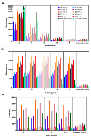 NPN efflux pump assay. Six selected bacterial strains (shown in the figure legend) were treated with serial dilutions of PAβN (A), colistin (B), or CCCP (C), either without adding glucose (marked with - g) or with glucose (marked with + g). The fluorescence level shown is after 5 min of incubation of bacteria pretreated with the test agents, after adding glucose to the appropriate cultures while keeping glucose-untreated cultures as comparators.