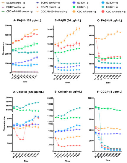 Efflux pump activity was examined and followed up in real-time by monitoring the change in NPN fluorescence over 5 min of treatment, as shown in Figure 7, which depicts three selected strains based on their responses to PAβN, namely strains CDC-AR-0346, EC477, and EC500. Bacteria were treated with high doses (64–128 µg/mL) and low doses (8 µg/mL) of PAβN (Figure 7A–C) to show the difference in their effect. Additionally, both a high dose (128 µg/mL) and a low dose (8 µg/mL) of colistin (Figure 7D,E) were used. A single dose of CCCP (4 µg/mL) was shown (Figure 7F), while other doses were not, as a non-significant difference was detected among them (as seen in Figure 6C). As shown in the figures, fluorescence was compared in bacteria incubated with and without glucose treatment.
