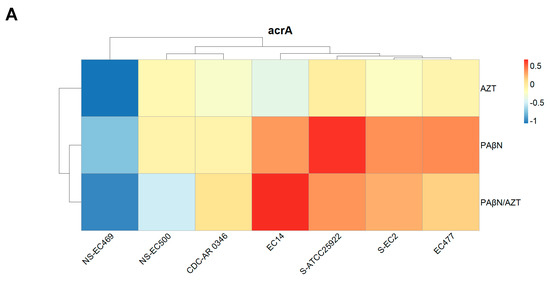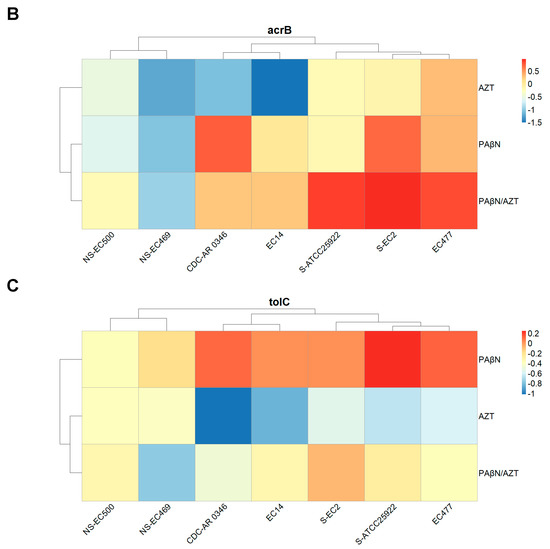 As shown in Figure 8, strains resistant to AZT with poor response to the synergetic combination (marked with NS) showed unique expression profiles for all three genes, which were lower than all the other strains. Gene expression was less in the bacteria treated with AZT compared to other forms of treatment, and the highest expression was noted for cultures treated with PAβN alone, especially for acrA and tolC. On the other hand, acrB expression was highest in cultures treated with the combination. There were strains with unique expression patterns, such as strain CDC-AR-0346. For acrA, the expression levels did not vary despite treatment with different agents, while expression levels were higher in PaβN-treated cells for both acrB and tolC.
