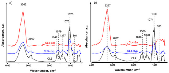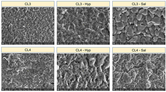 ATR-FTIR microscopy was used to determine the chemical binding and functional groups of the chitosan membranes and chitosan plant extract membranes. The recorded spectra of chitosan plant extract membranes were compared to those of chitosan membranes, as illustrated in Figure 1. Firstly, we analyzed the ATR-FTIR spectra of both CL3 and CL4 pure chitosan membranes, which presented a similar pattern. Thus, the pure chitosan membranes’ spectra showed a broad absorption peak between 3600 cm−1 and 3100 cm−1 that can be attributed to O–H and N–H stretching vibrations. The peaks corresponding to asymmetric and symmetric stretching vibrations of C–H bonds in -CH2 and -CH3 groups appeared at 2920 and 2870 cm−1, respectively. The absorption band between 1700 cm−1 and 1500 cm−1 was related to the vibrations of C=O bonds of amide groups (amide II) (1645 cm−1) and to the vibrations of amine groups (1580 cm−1). Bending vibrations of methyl and methylene groups were also visible at around 1416 cm−1 and 1377 cm−1, respectively. The spectra between 1160 cm−1 and 1000 cm−1 are attributed to the vibrations of the CO groups. Thus, according to literature data [59], the small peak located around 1145 cm−1 could be attributed to the asymmetric vibrations of CO in the oxygen bridge, resulting from the deacetylation of chitosan. Then, the peaks around 1075–1030 cm−1 are attributed to the vibration of CO groups of the ring COH, COC and CH2OH.