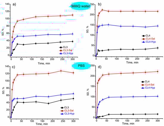 The swelling or water uptake capacity of a hydrogel is an important property, especially in wound healing when exudate absorption is required for healing [63]. Therefore, it is essential to develop some new materials with optimal sorption properties adequate for their use and to provide the optimal environment for wound healing.
