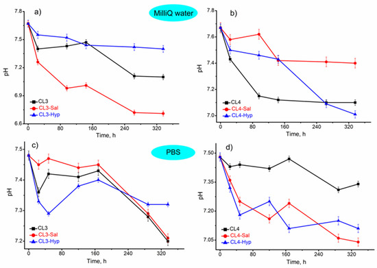 The influence of the membranes with or without plant extracts on the immersed fluids was also evaluated. This incubation study was conducted in order to observe the changes and perhaps the interactions that could appear when the membranes were soaked for 2 weeks in PBS and water. The results were illustrated in Figure 4. According to these results, it was observed that the pH decreases over time in both media. The samples immersed in Milli-Q water presented a decrease in the initial pH from 7.67 to 6.71 (CL3-Sal). The same trend was observed in PBS medium, when the pH decreased from 7.48 (initially) to 7.04 (CL4-Sal).
