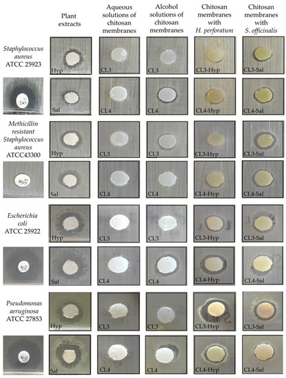 The plant extracts conferred significant antibacterial effects to the chitosan-based membranes toward S. aureus ATCC 25923, MRSA ATCC 43300, E. coli ATCC 25922 and P. aeruginosa ATCC 27853. The extract of S. officinalis incorporated into the chitosan membranes has slightly stronger antimicrobial activity against Gram-positive bacteria than the chitosan membranes loaded with H. perforatum.