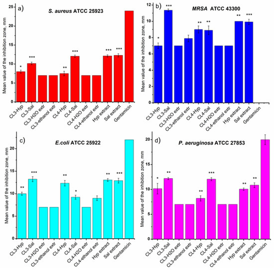 The antimicrobial activity of the chitosan membranes was influenced by the type of the plant extracts (Table 2, Figure 6). The results show that the extract of S. officinalis incorporated into the chitosan membranes has slightly stronger antimicrobial activity against Gram-positive bacteria than the chitosan membranes loaded with H. perforatum (Figure 6). In this regard, it was found that CL3-Hyp (8 mm) and CL4-Sal (12.06 mm) samples inhibited the multiplication of S. aureus species (Figure 7a). Against MRSA species (Figure 7b), the antimicrobial potential reversed so that the CL4-Hyp (9 mm) and CL3-Sal (11.36 mm) samples were most effective. This aspect is also maintained when Gram-negative species are tested, the extract of S. officinalis from chitosan membranes being more active than the extract of H. perforatum (Table 2). The exception is the CL4-Sal (9.23 mm) membrane, which was tested against E. coli (Figure 7c). Apparently, both chitosan membranes loaded with S. officinalis extract have almost identical inhibitory activity against P. aeruginosa (CL3-Sal, 12.2 mm and CL4-Sal, 12.06 mm), (Figure 7d).