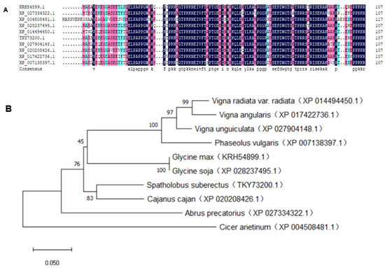 DNAMAN version 6.0 (Lynnon Biosoft, USA) and Mega version X were used to conduct the sequence alignments and to generate a phylogenetic tree. GmMBD10c protein contains an MBD domain, which is located at residues 17–81 [9] and is similar to the MBDs of several MBD-containing proteins in other leguminous plants, such as Glycine soja, Abrus precatorius and Phaseolus vulgaris (Figure 1). This result implies that the MBD proteins are conserved in Leguminosae.