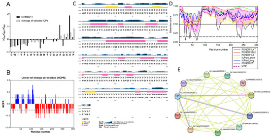 Bioinformatics analysis of the GmMBD10c protein. (A) The relative amino acid composition of GmMBD10c protein (black) and a set of disordered proteins selected from the DisProt database (white). (B) Charge distribution of GmMBD10c protein in CIDER. (C) Secondary structural prediction of GmMBD10c protein by PSIPRED. (D) Disorder prediction of GmMBD10c protein using RIDAO. (E) GmMBD10c-centered protein–protein interaction network generated by STRING.