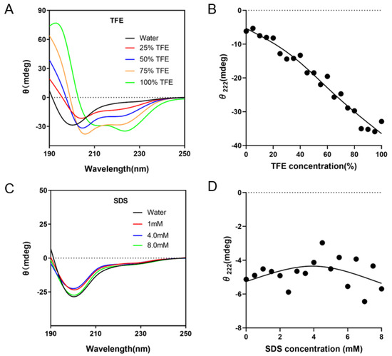 Circular dichroism analysis of the GmMBD10c protein in different solutions. The CD spectra of GmMBD10c protein were measured in aqueous solutions and in the presence of different concentrations of TFE (A) or SDS (C). The value of θ222 was plotted with the step-size of 5% of TFE (B) or 0.5 mM of SDS (D).