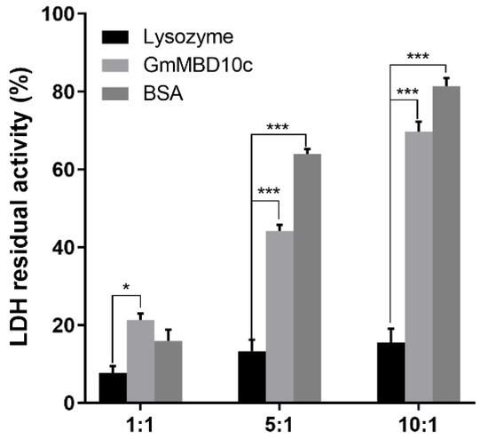 We studied whether GmMBD10c could preserve the LDH activity after freeze–thaw treatment, which normally damages the enzyme. Our analysis revealed that the LDH activity dropped below 20% after freeze–thaw cycling in the absence of GmMBD10c. At a ratio of 10:1 (GmMBD10c/LDH), the LDH activity was maintained at approximately 70% of the non-stressed levels, which is much higher than the effects observed when the negative control, lysozyme, was used. The efficiency of GmMBD10c to maintain the LDH activity was comparable to that of BSA, which was used in these experiments as a positive control. This shows that GmMBD10c can efficiently protect LDH from freeze–thaw damage (Figure 5).