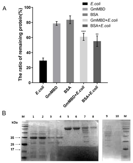 Soluble protein was extracted from E. coli cells, then quantified by a BCA assay. An amount of 1 g/L GmMBD10c or BSA was mixed with the proteome sample and incubated at 100 °C for 2 min. The soluble protein extract was used as a control. Samples were centrifuged at 10,000 rpm for 20 min at 4 °C. The protein in the supernatant was quantified again by a BCA assay.