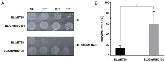 The spot assay and survival ratio of recombinants under 500 mM NaCl stress. (A) The growth performances of BL/GmMBD10c and BL/pET28 under normal or salt conditions were compared. Experiments were repeated three times and similar results were obtained. (B) The survival ratio assay was repeated three times and the significant differences were calculated by a student’s t test. * p < 0.05.