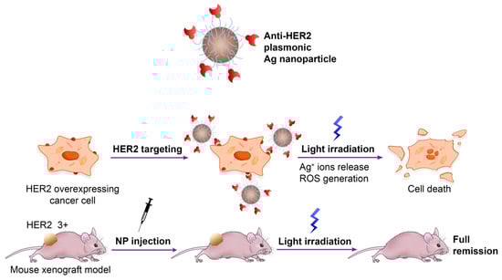 - Shipunova, V.O.; Belova, M.M.; Kotelnikova, P.A.; Shilova, O.N.; Mirkasymov, A.B.; Danilova, N.V.; Komedchikova, E.N.; Popovtzer, R.; Deyev, S.M.; Nikitin, M.P. Photothermal Therapy with HER2-Targeted Silver Nanoparticles Leading to Cancer Remission. Pharmaceutics 2022, 14, 1013. [Google Scholar] [CrossRef] [PubMed]