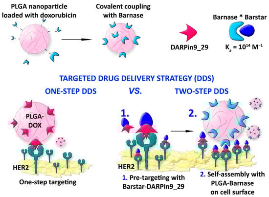 - Komedchikova, E.N.; Kolesnikova, O.A.; Tereshina, E.D.; Kotelnikova, P.A.; Sogomonyan, A.S.; Stepanov, A.V.; Deyev, S.M.; Nikitin, M.P.; Shipunova, V.O. Two-Step Targeted Drug Delivery via Proteinaceous Barnase-Barstar Interface and Doxorubicin-Loaded Nano-PLGA Outperforms One-Step Strategy for Targeted Delivery to HER2-Overexpressing Cells. Pharmaceutics 2023, 15, 52. [Google Scholar] [CrossRef]