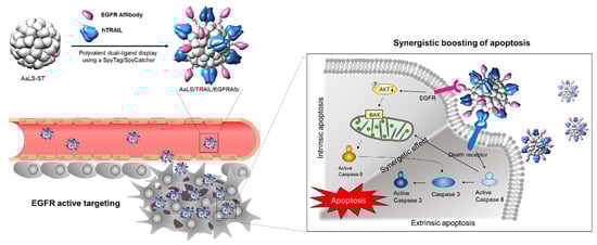 - Jun, H.; Jang, E.; Kim, H.; Yeo, M.; Park, S.G.; Lee, J.; Shin, K.J.; Chae, Y.C.; Kang, S.; Kim, E. TRAIL & EGFR affibody dual-display on a protein nanoparticle synergistically suppresses tumor growth. J. Control Release 2022, 349, 367–378. [Google Scholar] [CrossRef]