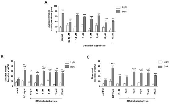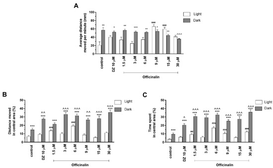 2.1.1. The Effects of Officinalin on Locomotor Activity and Thigmotaxis Behaviors of the Zebrafish Larvae during Light–Dark Changes