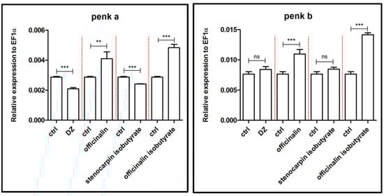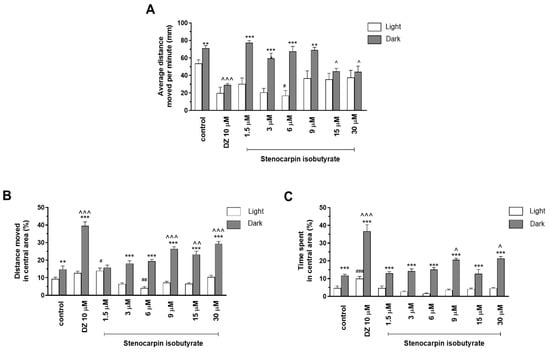 2.1.2. The Effects of Stenocarpin Isobutyrate on Locomotor Activity and Thigmotaxis Behaviors of the Zebrafish Larvae during Light–Dark Changes
