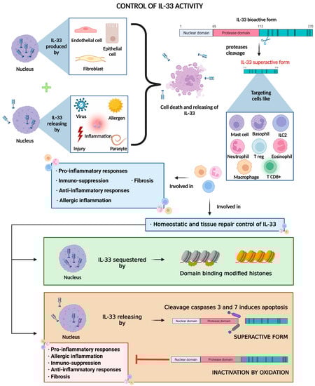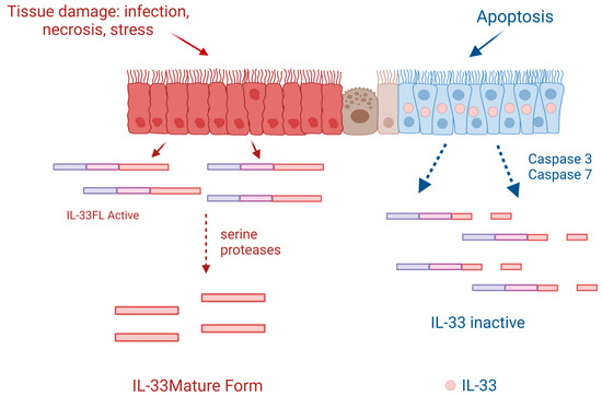 Regarding its cellular origin, IL-33 is predominantly found and produced by epithelial cells, fibroblasts, and endothelial cells [21]; however, its expression can also be induced in immune cells under certain inflammatory conditions [22]. Regarding biological function, IL-33 plays a dual-function role. On the one hand, it may have a role in tissue homeostasis while being sequestered in the nucleus, where it represses gene expression of certain inflammatory genes, and on the other hand, it is also involved in tissue repair and remodeling [23,24]. During inflammation and cellular necrosis, IL-33, which has been stored within the nucleus, is passively released, therefore playing an alarmin role, which is why IL-33 is included among the group of alarmins. In this scenario, IL-33 is processed by proteases and passes into its mature superactive form [25]. In contrast, during cellular apoptosis, IL-33 is retained within the cytoplasm of the cells and becomes inactivated by apoptotic proteases, such as caspase-3 and caspase-7 [10,26] (Figure 1 and Figure 2).