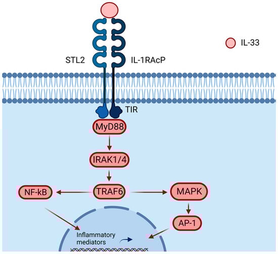 By playing its role as an alarmin, IL-33 alerts the immune system of damage [10] by binding to ST2, which is a member of the Toll-like receptor (TLR)/IL1R superfamily. The ST2 receptor is the main target of IL-33, and it is constitutively expressed by immune cells such as ILC2 [27], mast cells, and Tregs [28]. Moreover, IL-33 can also activate Th2 cells [29], basophils [30], eosinophils [31], M2 macrophages [32], and dendritic cells, which are involved in type 2 immunity and allergic inflammation [19,33,34]. Other immune cells that constitutively express ST2 and whose expression may be increased upon stimulation are natural killers (NK), invariant natural killer T cells (iNKT), and neutrophils [19]. Notably, ST2 is also expressed on goblet cells and epithelial cells, where they can further express IL-8 and IL-17F in an autocrine manner, leading to the amplification of inflammation [35,36]. Upon binding, the IL-33/ST2L complex binds to the ubiquitously expressed IL-1R accessory protein (IL-1RAcP), forming a heterodimer [37,38,39], and signaling is induced by dimerization of the Toll−interleukin-1 (TIR) cytoplasmic domains of IL-1RAcP and ST2. This leads to the recruitment of the adapter protein MyD88 and the activation of transcription factors such as NF-kappaB through TRAF6, IRAK-1/4, MAP kinases, and AP-1, producing the transcription of inflammatory mediators (Figure 3) [40].