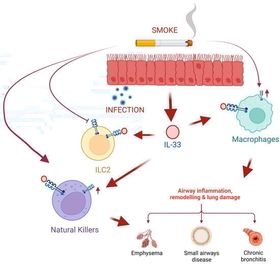 Cigarette smoke induces lung epithelial cells to produce high levels of IL-33 that will be released after cell damage, such as viral or bacterial infections. On the one hand, exposure to smoke inhibits the expression of the IL-33 (ST2) receptor in type 2 innate lymphoid cells (ILC2), which leads to the inhibition of ILC2 responses and the synthesis of cytokines induced by IL-33. Moreover, tobacco smoke favors the expression of ST2 in macrophages (M0) and natural killer (NK) cells. This leads to NK cell proliferation and increased production of the pro-inflammatory cytokine IFN-gamma leading to exacerbated COPD. Created with BioRender.com.