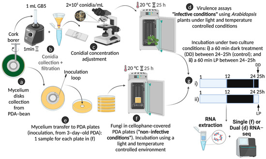 First, we determined the effect of a 60 min LP on the transcriptome of B. cinerea, but during the initial stages of the infection of A. thaliana plants. Therefore, in this study, we performed RNA-seq of fungus and host during infection to determine the changes in gene expression in both organisms. Virulence assays were conducted as previously described [29]. For this procedure, A. thaliana plants were first propagated in a 12 h:12 h LD regime at 20 °C using Percival incubators (Percival Scientific, IA, USA) equipped with cool white-light fluorescent tubes (light intensity up to 100 µmol/m2/s; wavelength 400–720 nm) employing the commercial substrate green power complete mix (TopCrop, Valencia, Spain). For virulence assays, B. cinerea conidia were collected from a well-sporulated PDA bean plate (seven days old; Figure 1a). A final concentration of 2 × 105 conidia/mL (in 7 µL) was suspended on Gamborg B5-2% glucose medium (GB5) with 10 mM KH2PO4-K2HPO4 at pH 6.4 (Figure 1b,c). Five-week-old A. thaliana (Col-0) plants were inoculated with the mentioned conidia suspension inside plastic boxes at 20 °C under a humid environment (Figure 1d). As mentioned above, two different lighting conditions were applied: the first set of infected plants (with B05.10 or ∆bcwcl1 B. cinerea strains) were incubated in LD for 24 h. After this period, between hours 24 and 25, this set of infected plants was kept in DD for 1 h and collected in the absence of light. The second set of infected plants was incubated for 60 min in light (LP) and then collected in the presence of light (Figure 1g). In the DD (control experiments) and LP treatments, infected leaves were flash-frozen and kept at −80 °C until RNA extraction.