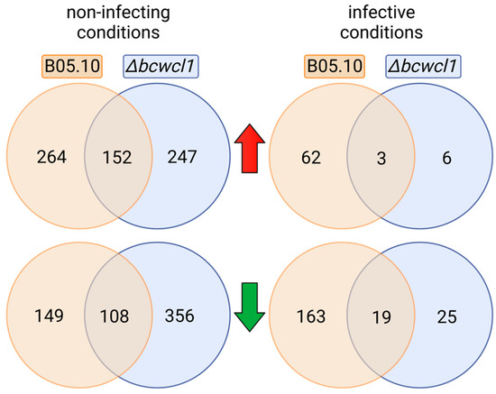 The effect of the genotype on gene expression was also analyzed. The ∆bcwcl1 mutant strain showed only nine light-induced genes (LIG) and 44 light-repressed genes (LRG) during A. thaliana infection (Figure 2, right panel). In contrast, when grown on PDA plates, the mutant showed 399 LIG and 464 LRG (Figure 2, left panel). Therefore, although there is a relevant number of BcWCL1-independent light responses in the mutant when examined in vitro, in planta, this number drops down, likely reflecting a massive remodeling of the underlying gene regulatory network in the latter condition. Interestingly, the number of LRGs observed for ∆bcwcl1 during non-infecting conditions was more extensive than that of the B05.10 strain (464 and 257, respectively). In contrast, the B05.10 strain showed a more significant number of DEGs during Arabidopsis infection in comparison with ∆bcwcl1 (four- and seven-fold increases; details in Table S2). In agreement with the latter observation, light-treated samples from the B05.10 strain infecting plants clustered more closely than any other cluster observed in the principal component analysis (PCA) (Figure S3), suggesting a particular transcriptomic state for these samples (see below). PCA also indicated that PC1 accounted for 71.15% of the observed total variation, segregating noninfective from infective culture conditions. The second component, explaining only 5.66% of the variance, segregated the culture conditions depending on the absence or presence of light.