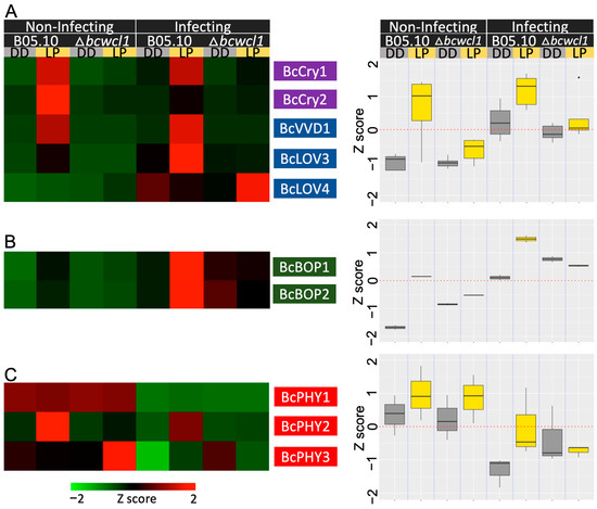 Clustering analysis of mRNA expression levels for all B. cinerea photoreceptor (PhR) encoding genes showing differential gene expression in response to a 60 min LP under non-infecting and infecting conditions. Heatmaps (left) and boxplots (right) illustrate normalized RNA-seq expression data, ranging from saturated green for log2 ratios −2.0 and below to saturated red for log2 ratios +2.0 and above. (A) Blue-light, (B) green-light, and (C) red-light receptors. A single row of colored boxes represents each PhRs. The average gene expression for each group of PhR is shown in the right panel.
