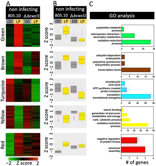 DEGs cluster analysis and overrepresented GO terms for genes during non-infecting conditions. The figure depicts the five major color-coded clusters of heatmaps (A) or boxplots (B) of co-regulated genes (from top to bottom, green, brown, turquoise, yellow, and red). Normalized RNA-seq expression data are indicated, ranging from saturated green for log2 ratios −2.0 and below to saturated red for log2 ratios +2.0 and above. Clustering analysis was performed using WGCNA. In (A), each gene is represented by a single row of colored lines. In (B), each boxplot represents the average expression of all genes contained in each cluster. In (C), the number of genes in different GO categories for biological processes is shown. Overrepresented categories are indicated compared to the entire set on the genome. The coloring of each bar matched those of each cluster, as indicated in (A). DD: darkness, LP: 60 min light pulse.