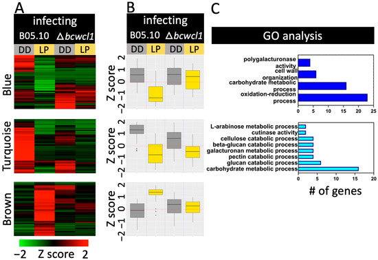 In contrast to the abovementioned remarks, during the infection of Arabidopsis leaves, we determined a lower B. cinerea transcriptional response to LP, with only 276 DEGs in both genotypes (223 only in B05.10, 29 only in ∆bcwcl1, and 24 in both strains). Only three groups of co-regulated genes in B. cinerea were observed (Table S6). The blue cluster in Figure 5 displays BcWCL1-dependent LRGs. GO terms were mainly represented by carbohydrate processes and stress-related functions. Importantly, this cluster also included biological and molecular functions related to the degradation of the plant cell wall, represented by bcpme1, bcpgx1, bcpg1/3/4, Bcin08g02390 encoding a peptidase, and virulence-related genes, including bcboa17, bcpme1, and bcnep2 (Table S6). The turquoise cluster also displayed LRGs; however, with the presence of BcWCL1-dependent and-independent genes (Figure 5, Table S6). In this latter group of genes, we observed different plant-cell-wall-related biological and molecular functions, including those of pectin esterases, proteases, and cutinases. In both the blue and turquoise clusters, several light-repressed glycosyl hydrolase (GH)-encoding genes (14 and 22, respectively) representing 16 different GH families were identified (Table S7). In contrast, the brown cluster is the only set of B. cinerea genes displaying light inducibility during the infection of Arabidopsis leaves, but no enriched GO terms were identified. Genes include the light-induced and WCL1-dependent bcfrq1 [9,14] and the recently characterized gene bcfet1 (formerly and incorrectly termed bclcc13) encoding a ferroxidase (and not a laccase) of the reductive iron assimilation system in which absent, hypervirulent, or increased infection is observed [29]. Additional genes include bcboa8 [22], bcltf1 [25], and those of photoreceptors (Table S3).